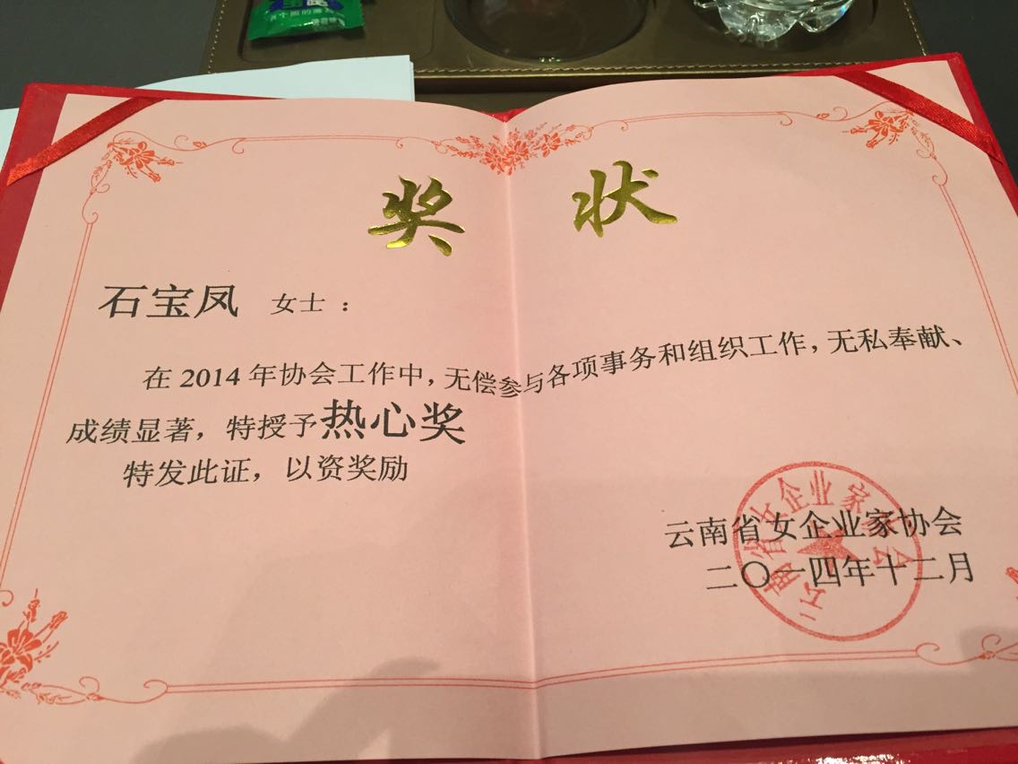 晶晶企業董事長喜獲云南省女企業家協會第五次代表大會頒發的熱心獎