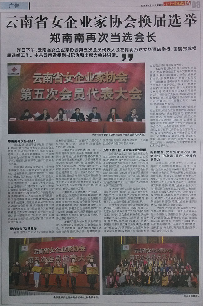 消息源引2015年1月20日云南信息報A版08頁。于2015年1月19日舉行的云南省女企業家協會第五次會員代表大會上,我司昆明市晶晶床墊家具制造有限公司董事長石寶鳳因在2014年協會工作中,無償參與各項協會亊物、無私奉獻且成績顯著,特被授予“熱心獎”的榮譽。且在當天舉行的云南省女企業家協會換屆選舉中,晶晶企業石寶鳳以91票贊成(有效人數95人) 的投票結果當選為協會副會長;以88票贊成(有效人數92)的投票結果當選為協會常務理事。