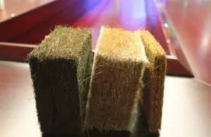 左邊是山棕,中間是纖維膠黏合的椰棕,右邊是化工膠黏合的椰棕